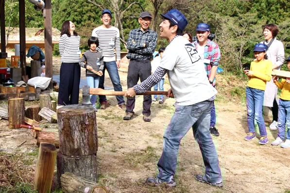休憩の後は腹ごなしにちょっと力仕事を。親子で薪割り体験です。まずは当社社長のデモンストレーション!なかなか割れない..!!!笑顔がこぼれます。