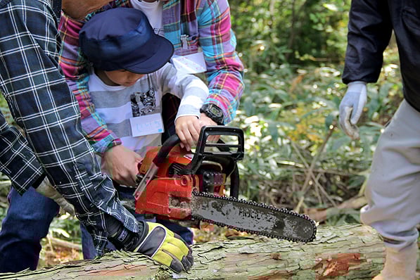 倒した木を小さく輪切りにしていきます。お父さんと一緒にはじめてのチェーンソー体験!ちょっと怖いけど、なかなかできない貴重な体験です。