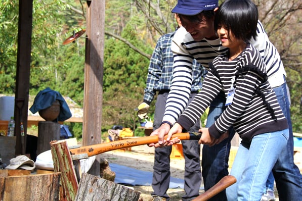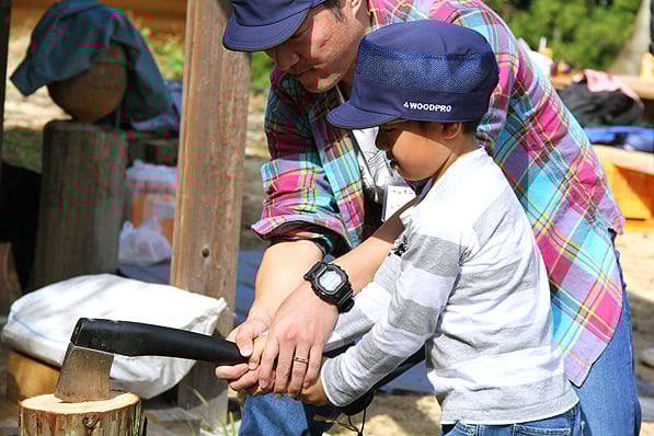 初めての斧は少し怖いけど・・・、お父さんと一緒ならがんばれますね♪
