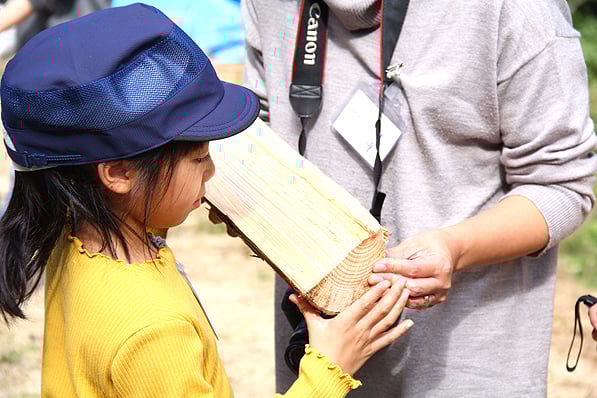 切りたての切り株を近くで見ながら、年輪について学びました。年輪を見るだけで、木の年齢や環境の変化が分かるなんて、不思議な感じですね。