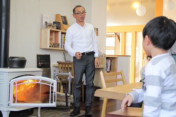 ストーブショップを運営している建築屋さんに、まずは家のに使う木の役割と構造を教えてもらいます。ここでも真剣にお話を聞きました。