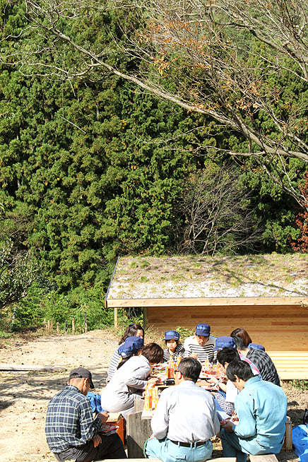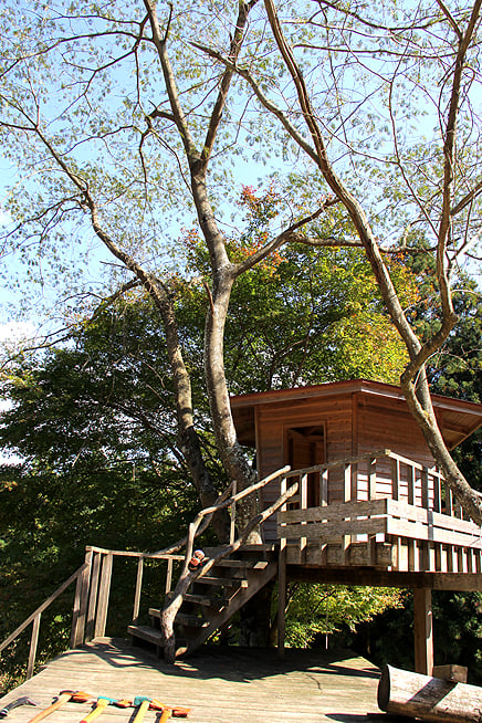 少し山を登って、お昼休憩は、素敵なツリーハウスのある広場にて。床下にはブランコもあって、お子さまたちも大喜びです。