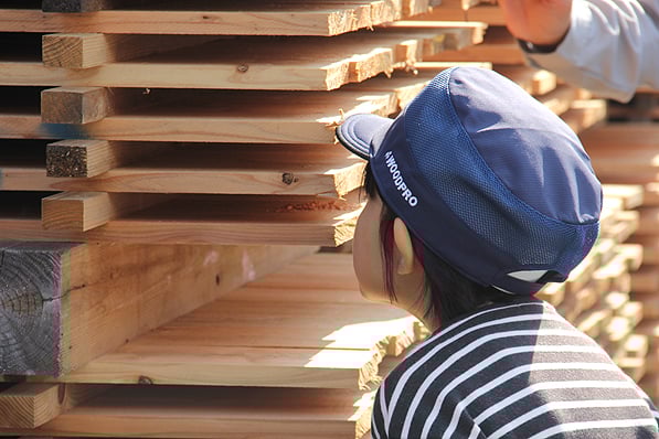 山での見学を終え、木材工場に移動しました。伐採した木材を、どのように加工して使用するのか、どんなものになっていくのか、説明を聞きました。