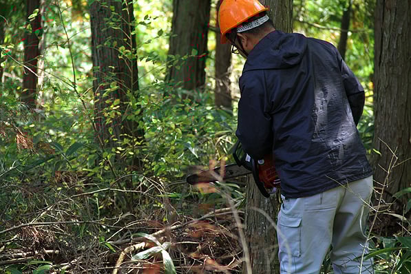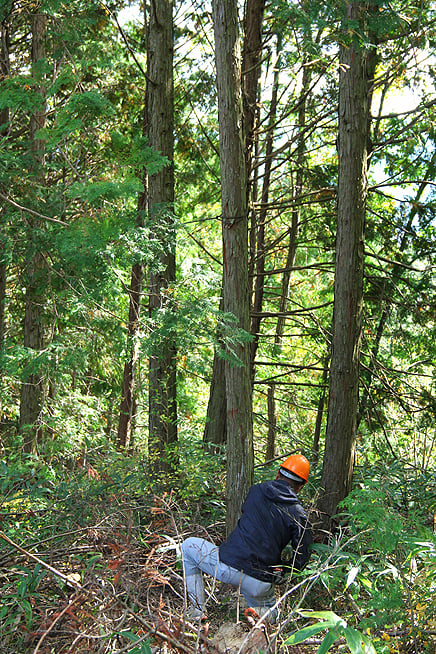 お話の後、実際木を切る工程を見学しました。倒れる方向や高さなどを計算し切る角度や位置を決めます。