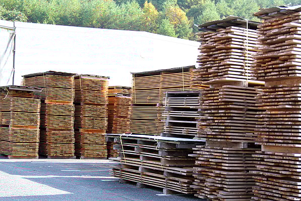 工場の敷地内には板状になった木材が山積み!これが加工され、家具になっていくのですね。