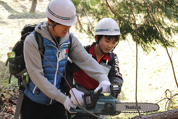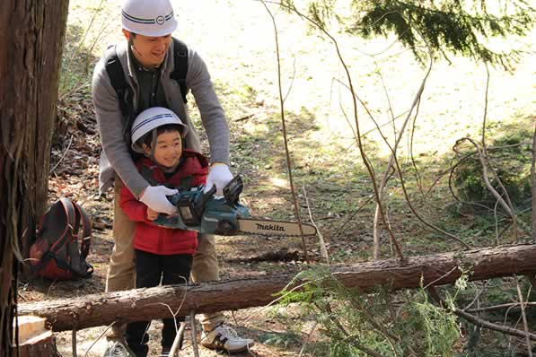お父さんと一緒にはじめてのチェーンソー体験!ちょっと怖いけど、なかなかできない貴重な体験です。