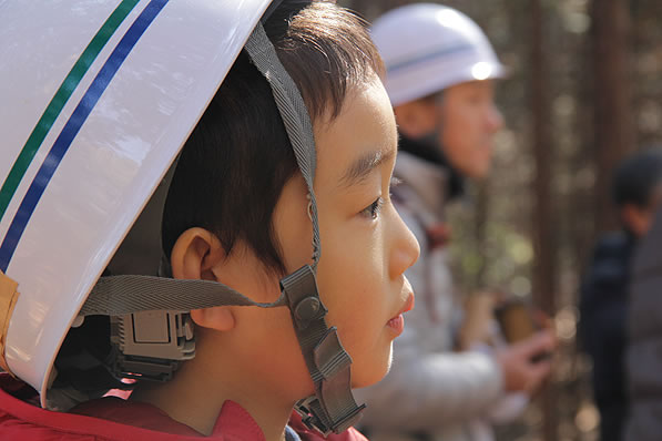 ここからは実際に木を切る工程を見学です。安全のためヘルメットを被ります。