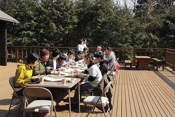 ぽかぽか陽気の中、森のすぐ横にあるロッジのテラスでいただきました。
