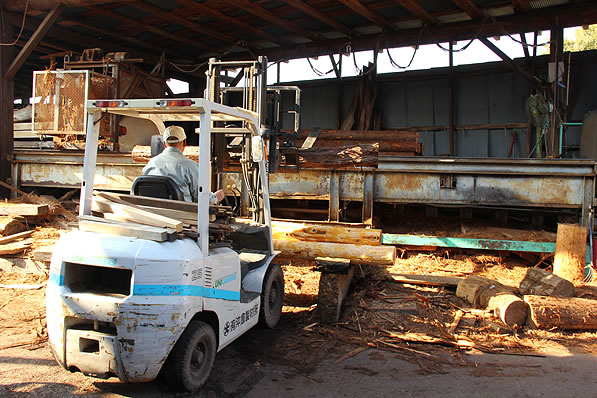 次は、実際に丸太が木材になるまでを見学させていただきます。まずは、丸太をフォークリフトですいすいっと皮を剥く機械に運びます。