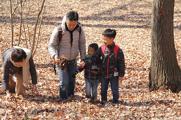 一面の落ち葉のじゅうたん。手触り、踏み心地、質感など、家族で一緒に体感できました。