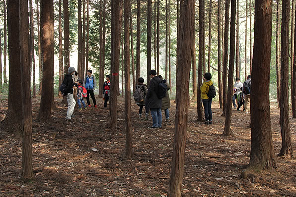 ごはんを食べた後は再び林の中を散策します。普段では気付けない木の種類の小さな違いを見つける事ができました。